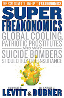 Actually, let me take that back. You can judge a book by its cover, somewhat. As if the graphic design doesn’t scream “Please Pay Attention” loudly enough, the content itself immediately continues the theme. The first two sentences of the book proclaim, “The time has come to admit that in our first book [Freakonomics], we lied. Twice.” Pages later, we read that “as you leave your friend’s party [in an intoxicated state], the decision should be clear: driving is safer than walking.” (One wonders if that last line will eventually provoke a second admission of lying in the next installment, which must inevitably be titled SuperDuperFreakonomics: Funny Wars, Political PMS, and Why Rapists Make the Best Babysitters.)